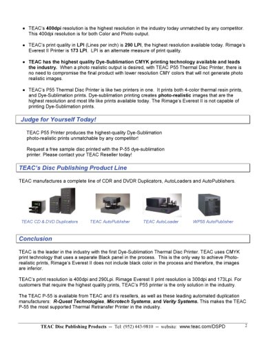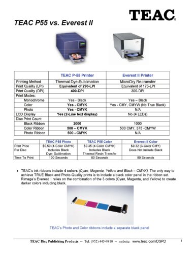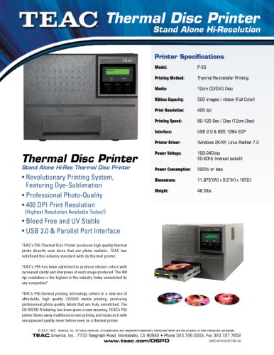 TEAC P-55 produces the world's finest high-quality professionally printed CD and DVD discs. Thanks to an innovative thermal retransfer print system, 4-color, extremely durable CD/DVD full color CMYK discs can be created quickly and effortlessly. Produce fantastic looking CD/DVD discs on demand and up to 1,000 monochrome or 500 4-color discs per ribbon. The discs once printed are scratchproof, UV-protected and water repellent. The TEAC P-55: the economical standalone solution for high quality, professionally finished CD/DVD discs. Discover the next generation CD/DVD printing technology!